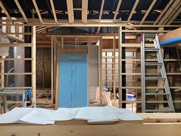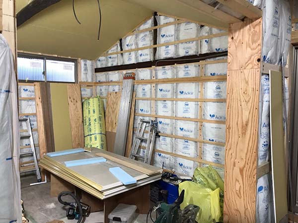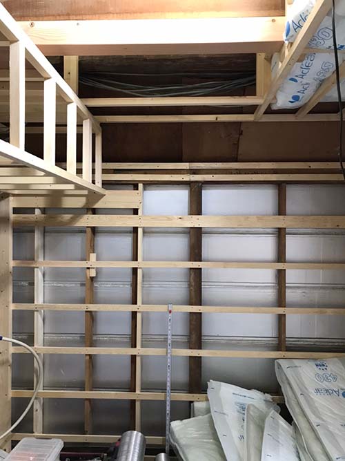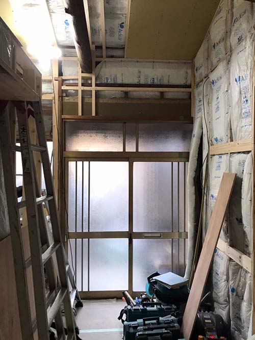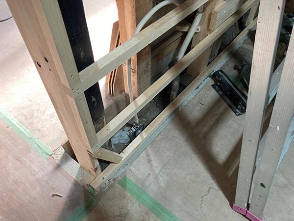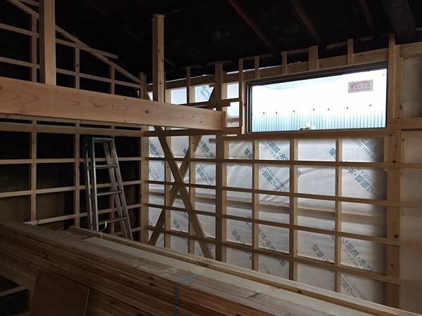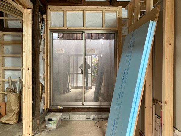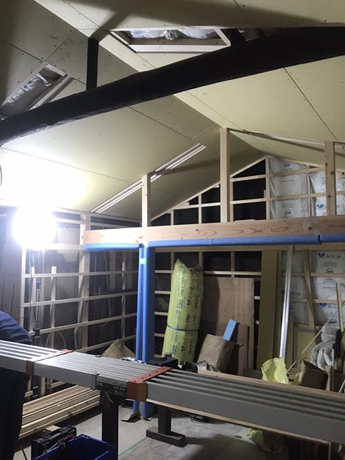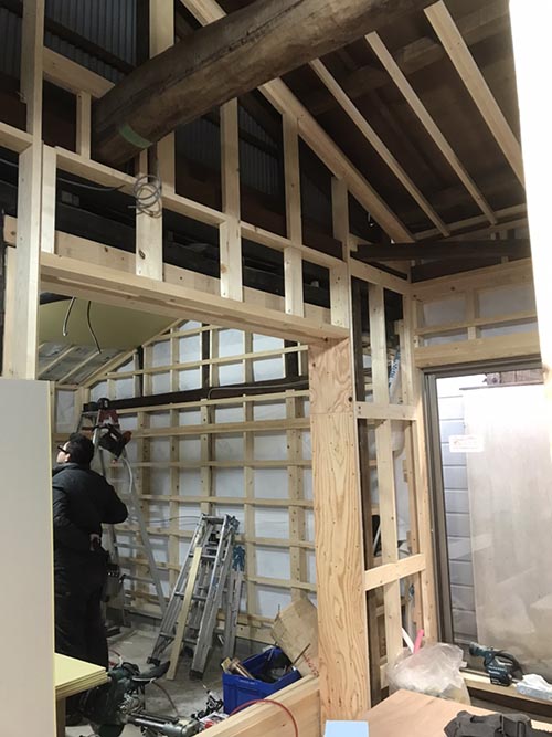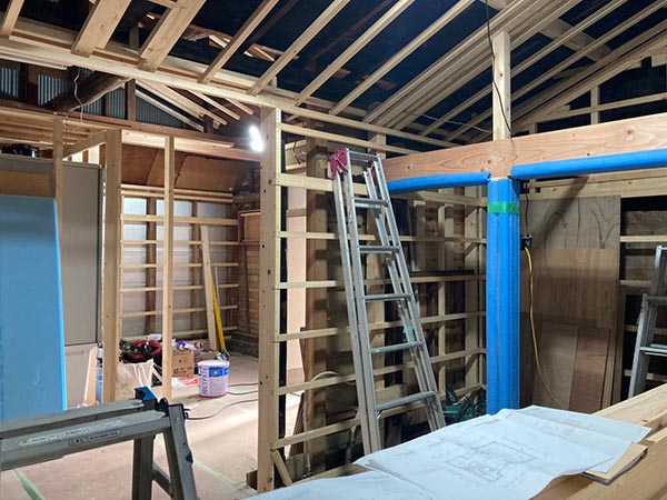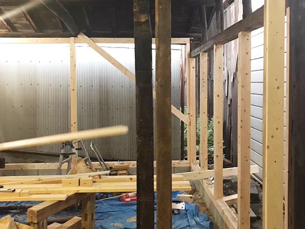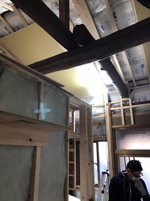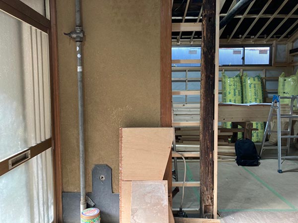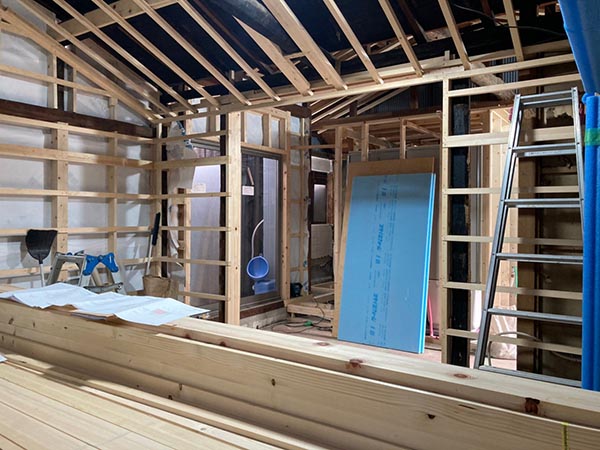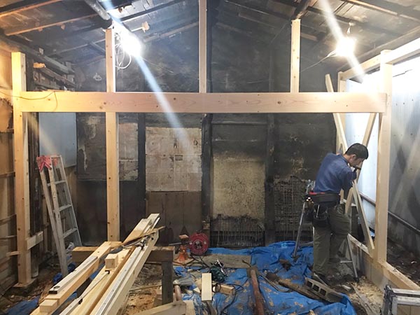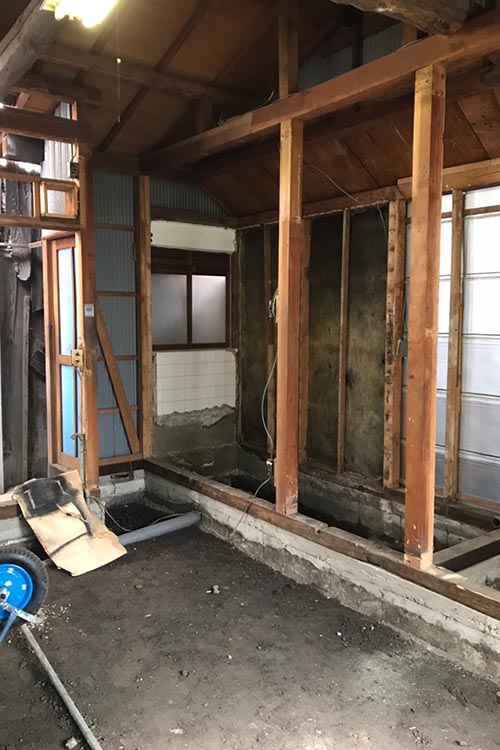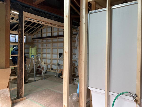 構造補強をしながら新たに建てる壁部分はスケルトン状態に。同時に配管工事を進めていく