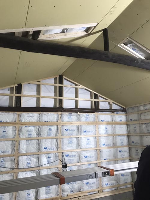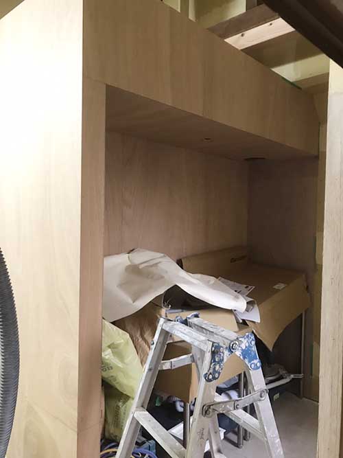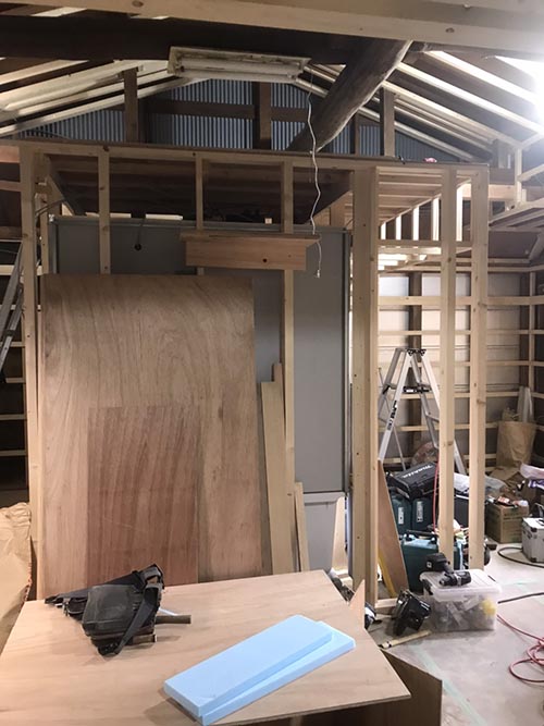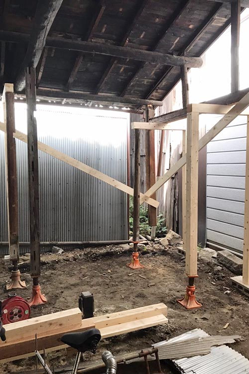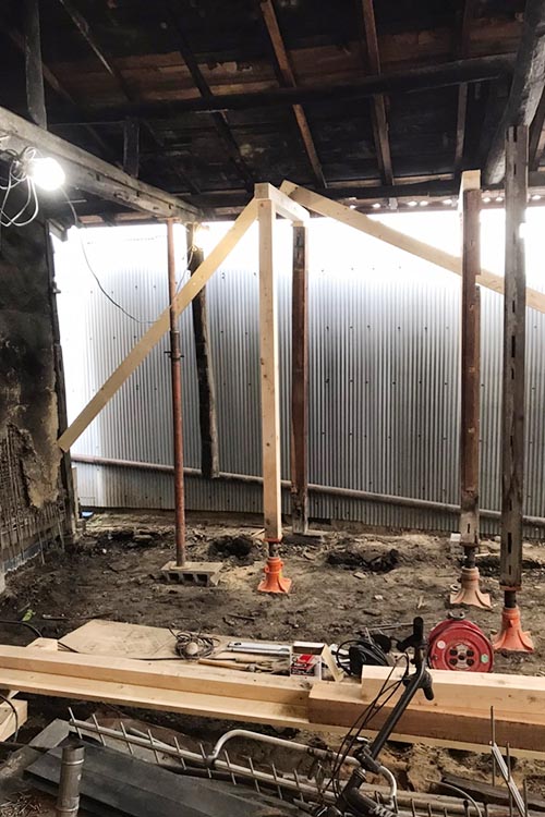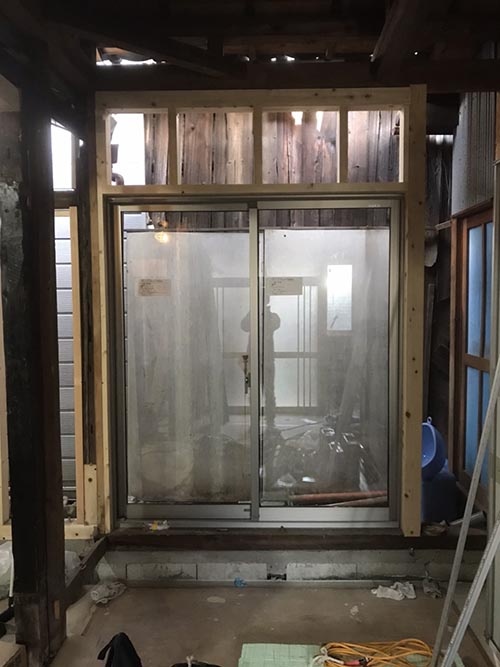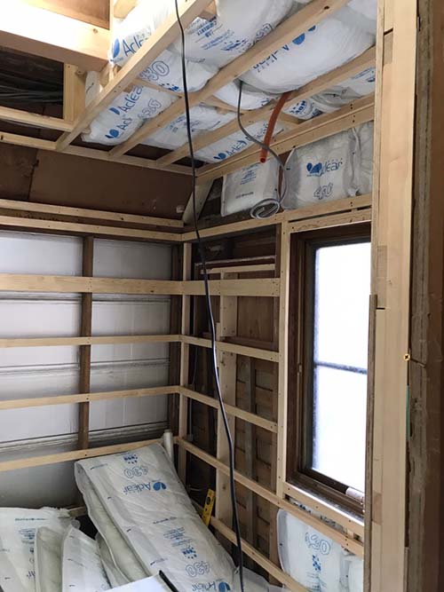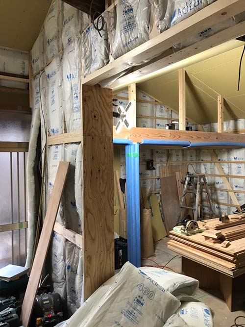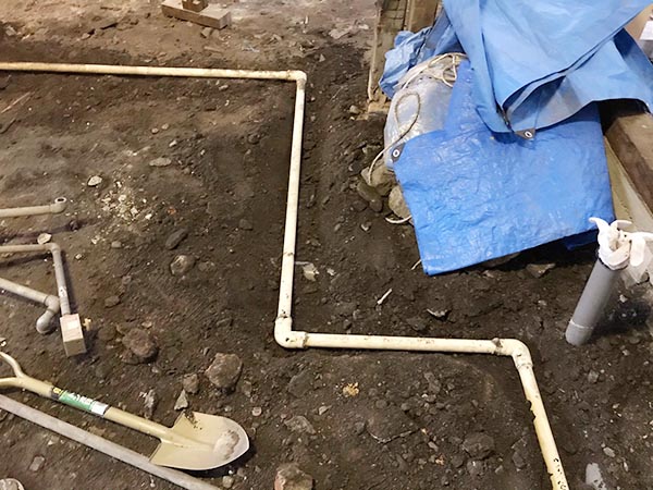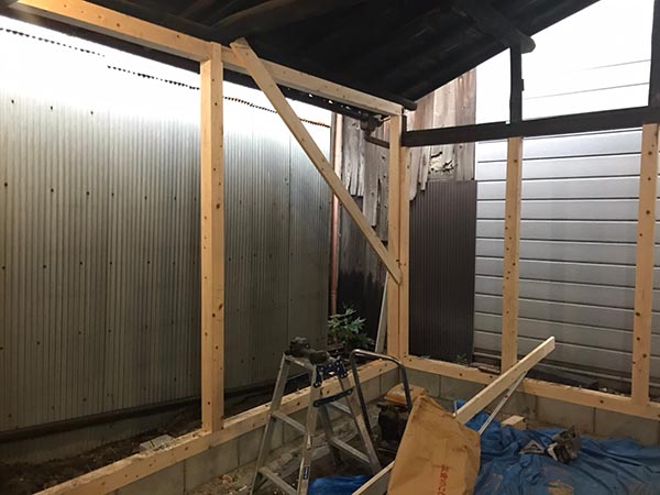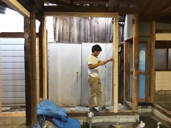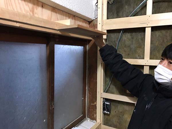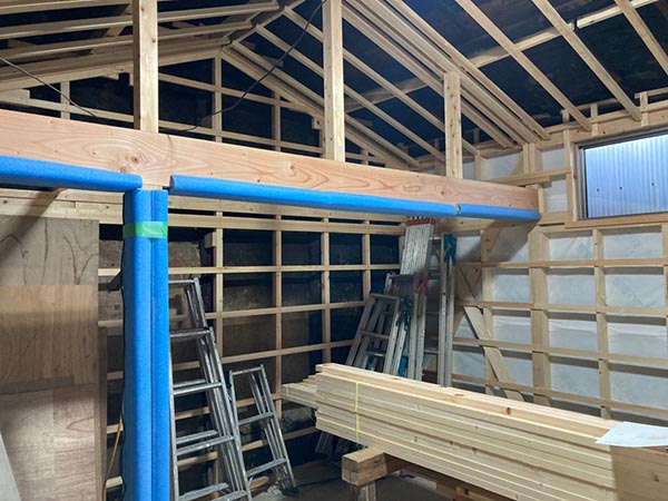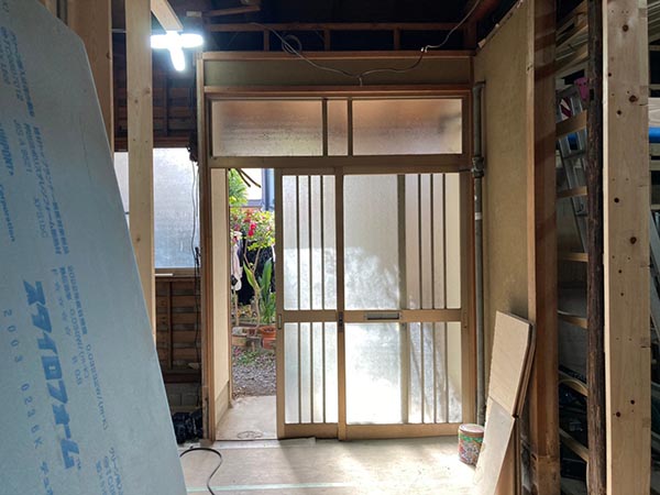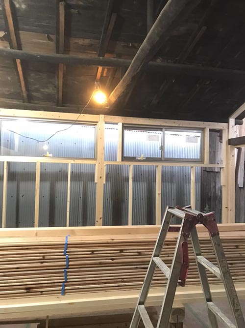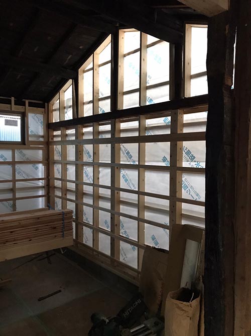 構造補強をしながら新たに建てる壁部分はスケルトン状態に。同時に配管工事を進めていく