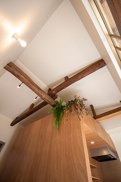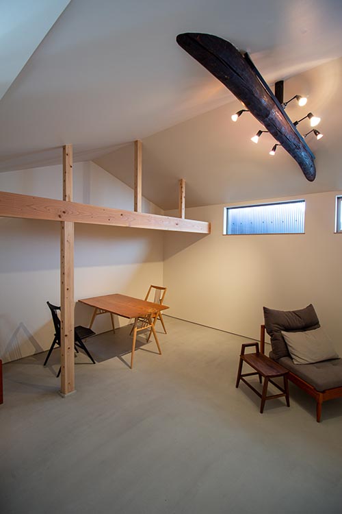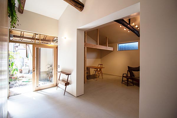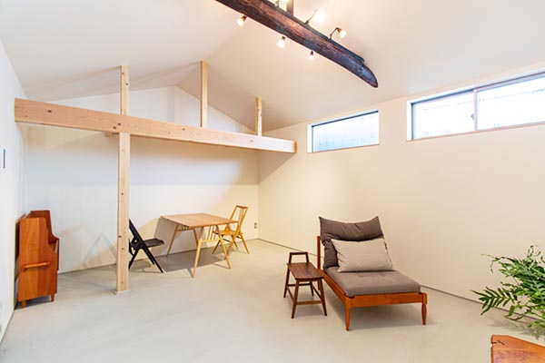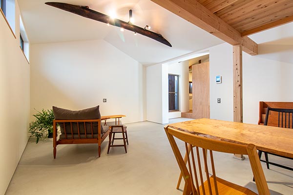 リビングには土間をしつらえ、オフィスや作業場としても利用しやすいように。天井の空間を利用してロフトをつくり、限られたスペースを効率的に活用しました。
