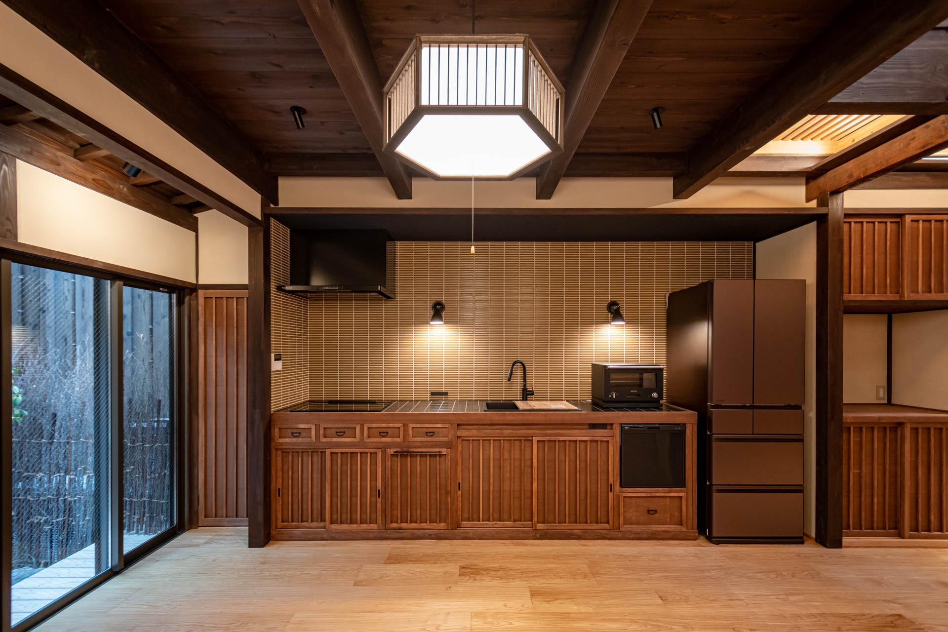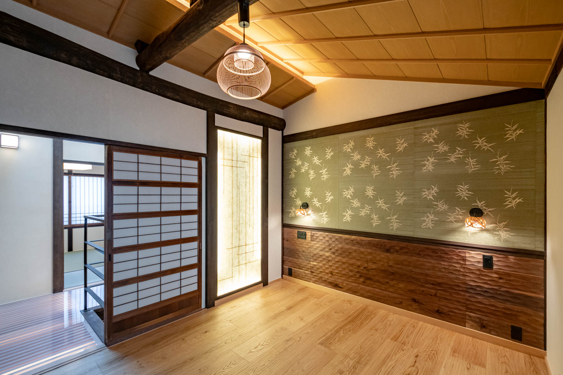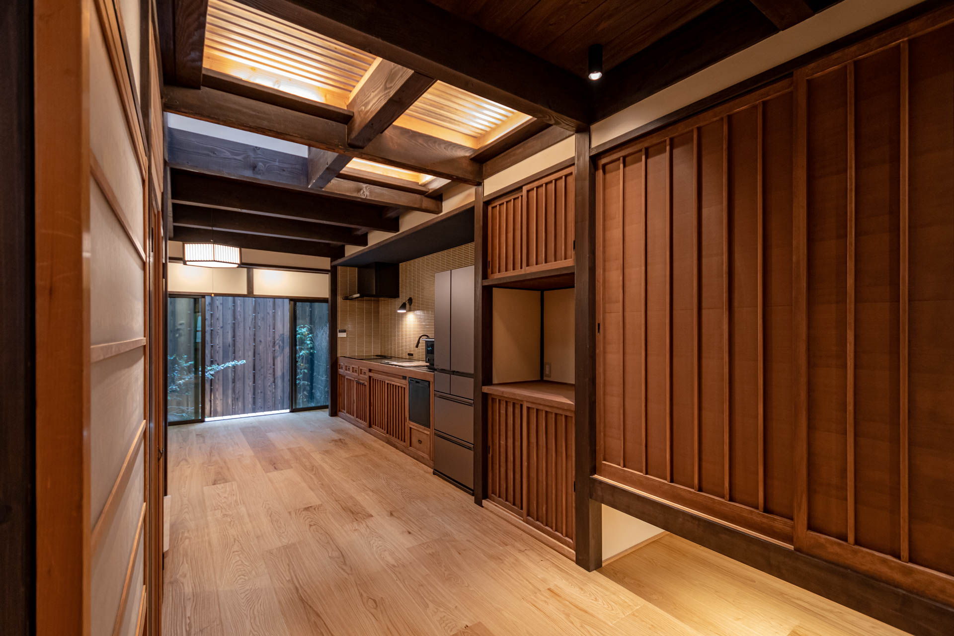 続くリビングはオーナー様のこだわりをつめこんだ上質な和の空間に。坪庭まで視界が抜け直線で組み合わされた木材がシャープでスタイリッシュな空間を演出します。