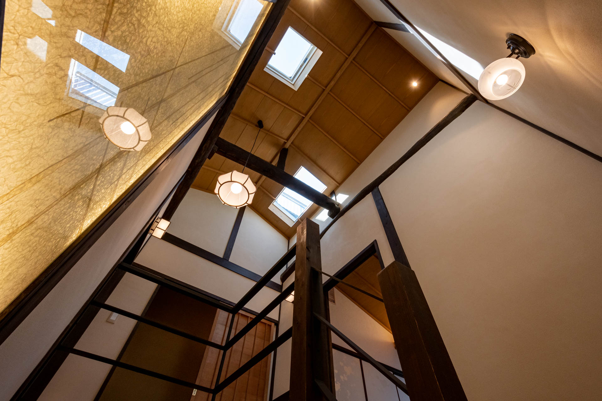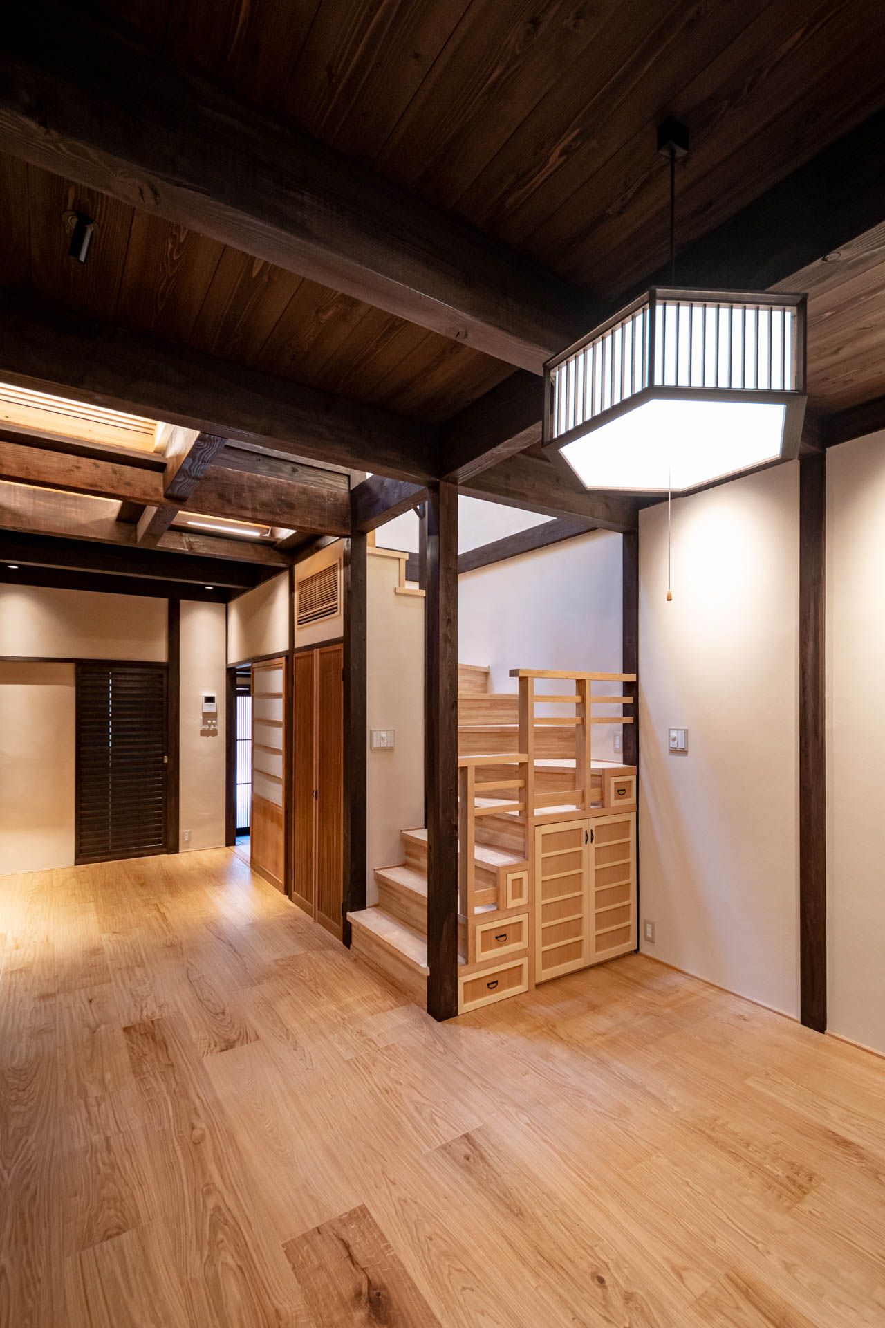 天井を高くとり、町家従来のせま苦しさを緩和しました。美しい和のリビングに二階へ上がるだけ・デッドスペースに収納があるだけという機能だけの階段ではもったいないので、流れるような線で空間のデザインの一つであるかのように意識して設計しています。