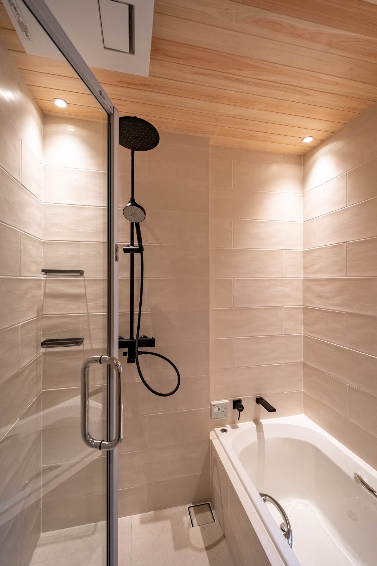 象牙色のやわらかい質感のタイルを巡らせ、シャワーや蛇口には黒いマットな質感のものを選びました。