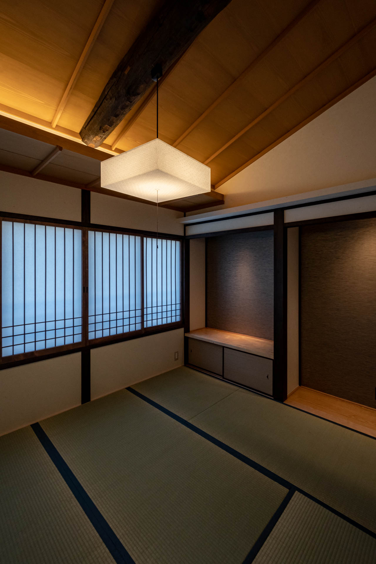 2階の北側和室は、こじんまりとしながらも、季節のものや掛け軸をかざることのできる床の間を設置。やわらかい光をとどける四角が印象的な照明はオーナー様のチョイスによるものでセンスが光ります。